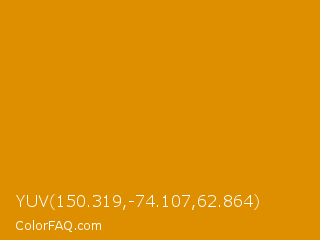 YUV 150.319,-74.107,62.864 Color is a normal orange color and the nearest color is Harvest Gold #da9100. Hex code #de8f00 and RGB value is rgb(222,143,-0). In RGB color space, this color is composed of 87% red, 56% green, 0% blue, In CMYK color space, this color is composed of 0% cyan, 36% magenta, 100% yellow , 13% black , In HSL color space, this color has a hue angle of 39° , 100% saturation and 44% lightness.