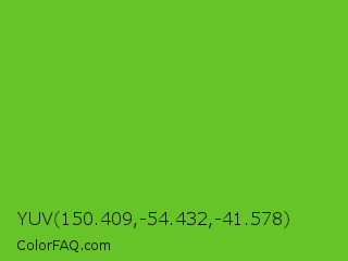 YUV 150.409,-54.432,-41.578 Color is a normal green color and the nearest color is Green RYB #66b032. Hex code #67c428 and RGB value is rgb(103,196,40). In RGB color space, this color is composed of 40% red, 77% green, 16% blue, In CMYK color space, this color is composed of 47% cyan, 0% magenta, 80% yellow , 23% black , In HSL color space, this color has a hue angle of 96° , 66% saturation and 46% lightness.