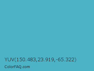 YUV 150.483,23.919,-65.322 Color is a normal cyan color and the nearest color is Maximum Blue #47abcc. Hex code #4cb3c7 and RGB value is rgb(76,179,199). In RGB color space, this color is composed of 30% red, 70% green, 78% blue, In CMYK color space, this color is composed of 62% cyan, 10% magenta, 0% yellow , 22% black , In HSL color space, this color has a hue angle of 190° , 52% saturation and 54% lightness.