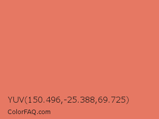 YUV 150.496,-25.388,69.725 Color is a light red color and the nearest color is Terracotta #e2725b. Hex code #e67863 and RGB value is rgb(230,120,99). In RGB color space, this color is composed of 90% red, 47% green, 39% blue, In CMYK color space, this color is composed of 0% cyan, 48% magenta, 57% yellow , 10% black , In HSL color space, this color has a hue angle of 10° , 72% saturation and 65% lightness.