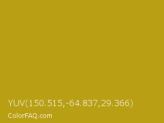 YUV 150.515,-64.837,29.366 Color is a normal yellow color and the nearest color is Sahara #b7a214. Hex code #b89f13 and RGB value is rgb(184,159,19). In RGB color space, this color is composed of 72% red, 62% green, 7% blue, In CMYK color space, this color is composed of 0% cyan, 14% magenta, 90% yellow , 28% black , In HSL color space, this color has a hue angle of 51° , 81% saturation and 40% lightness.