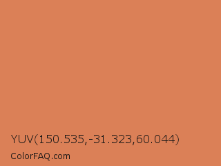 YUV 150.535,-31.323,60.044 Color is a normal orange color and the nearest color is Raw Sienna #d68a59. Hex code #db8057 and RGB value is rgb(219,128,87). In RGB color space, this color is composed of 86% red, 50% green, 34% blue, In CMYK color space, this color is composed of 0% cyan, 42% magenta, 60% yellow , 14% black , In HSL color space, this color has a hue angle of 19° , 65% saturation and 60% lightness.