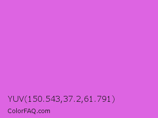 YUV 150.543,37.2,61.791 Color is a light magenta color and the nearest color is Orchid #da70d6. Hex code #dd64e2 and RGB value is rgb(221,100,226). In RGB color space, this color is composed of 87% red, 39% green, 89% blue, In CMYK color space, this color is composed of 2% cyan, 56% magenta, 0% yellow , 11% black , In HSL color space, this color has a hue angle of 298° , 68% saturation and 64% lightness.