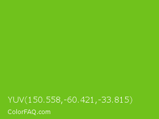 YUV 150.558,-60.421,-33.815 Color is a normal green color and the nearest color is Lima #76bd17. Hex code #70c21c and RGB value is rgb(112,194,28). In RGB color space, this color is composed of 44% red, 76% green, 11% blue, In CMYK color space, this color is composed of 42% cyan, 0% magenta, 86% yellow , 24% black , In HSL color space, this color has a hue angle of 90° , 75% saturation and 44% lightness.