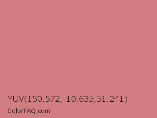 YUV 150.572,-10.635,51.241 Color is a light red color and the nearest color is New York Pink #d7837f. Hex code #d17d81 and RGB value is rgb(209,125,129). In RGB color space, this color is composed of 82% red, 49% green, 51% blue, In CMYK color space, this color is composed of 0% cyan, 40% magenta, 38% yellow , 18% black , In HSL color space, this color has a hue angle of 357° , 48% saturation and 65% lightness.