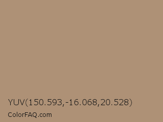 YUV 150.593,-16.068,20.528 Color is a normal orange color and the nearest color is Sandrift #ab917a. Hex code #ae9176 and RGB value is rgb(174,145,118). In RGB color space, this color is composed of 68% red, 57% green, 46% blue, In CMYK color space, this color is composed of 0% cyan, 17% magenta, 32% yellow , 32% black , In HSL color space, this color has a hue angle of 29° , 26% saturation and 57% lightness.