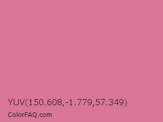 YUV 150.608,-1.779,57.349 Color is a light rose color and the nearest color is Charm #d47494. Hex code #d87693 and RGB value is rgb(216,118,147). In RGB color space, this color is composed of 85% red, 46% green, 58% blue, In CMYK color space, this color is composed of 0% cyan, 45% magenta, 32% yellow , 15% black , In HSL color space, this color has a hue angle of 342° , 56% saturation and 65% lightness.