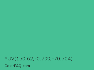 YUV 150.62,-0.799,-70.704 Color is a normal green color and the nearest color is Ocean Green #48bf91. Hex code #46c095 and RGB value is rgb(70,192,149). In RGB color space, this color is composed of 27% red, 75% green, 58% blue, In CMYK color space, this color is composed of 64% cyan, 0% magenta, 22% yellow , 25% black , In HSL color space, this color has a hue angle of 159° , 49% saturation and 51% lightness.