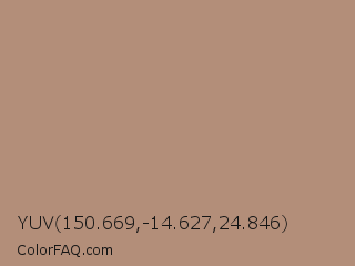 YUV 150.669,-14.627,24.846 Color is a normal orange color and the nearest color is Sandrift #ab917a. Hex code #b38e79 and RGB value is rgb(179,142,121). In RGB color space, this color is composed of 70% red, 56% green, 47% blue, In CMYK color space, this color is composed of 0% cyan, 21% magenta, 32% yellow , 30% black , In HSL color space, this color has a hue angle of 22° , 28% saturation and 59% lightness.