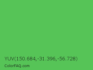 YUV 150.684,-31.396,-56.728 Color is a normal green color and the nearest color is Fern #63b76c. Hex code #56c457 and RGB value is rgb(86,196,87). In RGB color space, this color is composed of 34% red, 77% green, 34% blue, In CMYK color space, this color is composed of 56% cyan, 0% magenta, 56% yellow , 23% black , In HSL color space, this color has a hue angle of 121° , 48% saturation and 55% lightness.