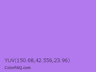 YUV 150.68,42.556,23.96 Color is a light violet color and the nearest color is Lavender #b57edc. Hex code #b278ed and RGB value is rgb(178,120,237). In RGB color space, this color is composed of 70% red, 47% green, 93% blue, In CMYK color space, this color is composed of 25% cyan, 49% magenta, 0% yellow , 7% black , In HSL color space, this color has a hue angle of 270° , 76% saturation and 70% lightness.