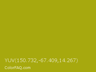 YUV 150.732,-67.409,14.267 Color is a normal yellow color and the nearest color is Sahara #b7a214. Hex code #a7a90e and RGB value is rgb(167,169,14). In RGB color space, this color is composed of 65% red, 66% green, 5% blue, In CMYK color space, this color is composed of 1% cyan, 0% magenta, 92% yellow , 34% black , In HSL color space, this color has a hue angle of 61° , 85% saturation and 36% lightness.