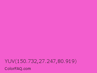 YUV 150.732,27.247,80.919 Color is a light magenta color and the nearest color is Light Deep Pink #ff5ccd. Hex code #f35dce and RGB value is rgb(243,93,206). In RGB color space, this color is composed of 95% red, 36% green, 81% blue, In CMYK color space, this color is composed of 0% cyan, 62% magenta, 15% yellow , 5% black , In HSL color space, this color has a hue angle of 315° , 86% saturation and 66% lightness.