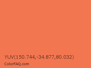 YUV 150.744,-34.877,80.032 Color is a light red color and the nearest color is Mandarin #f37a48. Hex code #f27650 and RGB value is rgb(242,118,80). In RGB color space, this color is composed of 95% red, 46% green, 31% blue, In CMYK color space, this color is composed of 0% cyan, 51% magenta, 67% yellow , 5% black , In HSL color space, this color has a hue angle of 14° , 86% saturation and 63% lightness.