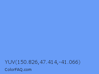 YUV 150.826,47.414,-41.066 Color is a light blue color and the nearest color is Cornflower Blue #6495ed. Hex code #689cf7 and RGB value is rgb(104,156,247). In RGB color space, this color is composed of 41% red, 61% green, 97% blue, In CMYK color space, this color is composed of 58% cyan, 37% magenta, 0% yellow , 3% black , In HSL color space, this color has a hue angle of 218° , 90% saturation and 69% lightness.