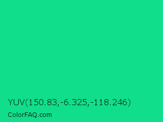YUV 150.83,-6.325,-118.246 Color is a normal green color and the nearest color is Caribbean Green #00cc99. Hex code #10de8a and RGB value is rgb(16,222,138). In RGB color space, this color is composed of 6% red, 87% green, 54% blue, In CMYK color space, this color is composed of 93% cyan, 0% magenta, 38% yellow , 13% black , In HSL color space, this color has a hue angle of 156° , 87% saturation and 47% lightness.