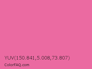 YUV 150.841,5.008,73.807 Color is a light rose color and the nearest color is Cyclamen #f56fa1. Hex code #eb6aa1 and RGB value is rgb(235,106,161). In RGB color space, this color is composed of 92% red, 42% green, 63% blue, In CMYK color space, this color is composed of 0% cyan, 55% magenta, 31% yellow , 8% black , In HSL color space, this color has a hue angle of 334° , 76% saturation and 67% lightness.
