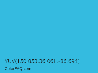 YUV 150.853,36.061,-86.694 Color is a normal cyan color and the nearest color is Scooter #2ebfd4. Hex code #34bbe0 and RGB value is rgb(52,187,224). In RGB color space, this color is composed of 20% red, 73% green, 88% blue, In CMYK color space, this color is composed of 77% cyan, 17% magenta, 0% yellow , 12% black , In HSL color space, this color has a hue angle of 193° , 74% saturation and 54% lightness.
