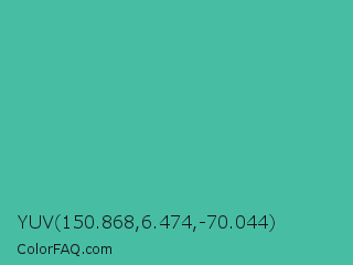 YUV 150.868,6.474,-70.044 Color is a normal cyan color and the nearest color is Puerto Rico #3fc1aa. Hex code #47bda4 and RGB value is rgb(71,189,164). In RGB color space, this color is composed of 28% red, 74% green, 64% blue, In CMYK color space, this color is composed of 62% cyan, 0% magenta, 13% yellow , 26% black , In HSL color space, this color has a hue angle of 167° , 47% saturation and 51% lightness.