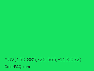 YUV 150.885,-26.565,-113.032 Color is a normal green color and the nearest color is Malachite #0bda51. Hex code #16e361 and RGB value is rgb(22,227,97). In RGB color space, this color is composed of 9% red, 89% green, 38% blue, In CMYK color space, this color is composed of 90% cyan, 0% magenta, 57% yellow , 11% black , In HSL color space, this color has a hue angle of 142° , 82% saturation and 49% lightness.