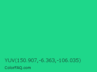 YUV 150.907,-6.363,-106.035 Color is a normal green color and the nearest color is Shamrock #33cc99. Hex code #1ed78a and RGB value is rgb(30,215,138). In RGB color space, this color is composed of 12% red, 84% green, 54% blue, In CMYK color space, this color is composed of 86% cyan, 0% magenta, 36% yellow , 16% black , In HSL color space, this color has a hue angle of 155° , 76% saturation and 48% lightness.