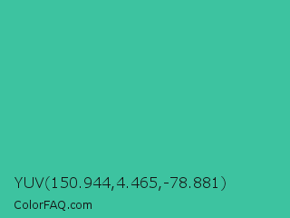 YUV 150.944,4.465,-78.881 Color is a normal cyan color and the nearest color is Puerto Rico #3fc1aa. Hex code #3dc3a0 and RGB value is rgb(61,195,160). In RGB color space, this color is composed of 24% red, 76% green, 63% blue, In CMYK color space, this color is composed of 69% cyan, 0% magenta, 18% yellow , 24% black , In HSL color space, this color has a hue angle of 164° , 53% saturation and 50% lightness.