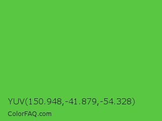 YUV 150.948,-41.879,-54.328 Color is a normal green color and the nearest color is Green RYB #66b032. Hex code #59c742 and RGB value is rgb(89,199,66). In RGB color space, this color is composed of 35% red, 78% green, 26% blue, In CMYK color space, this color is composed of 55% cyan, 0% magenta, 67% yellow , 22% black , In HSL color space, this color has a hue angle of 110° , 54% saturation and 52% lightness.