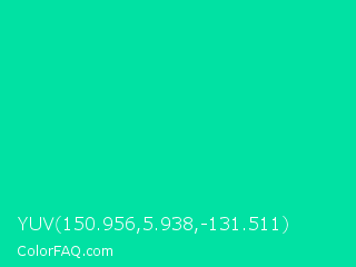 YUV 150.956,5.938,-131.511 Color is a normal green color and the nearest color is Caribbean Green #00cc99. Hex code #01e1a3 and RGB value is rgb(1,225,163). In RGB color space, this color is composed of 0% red, 88% green, 64% blue, In CMYK color space, this color is composed of 100% cyan, 0% magenta, 28% yellow , 12% black , In HSL color space, this color has a hue angle of 163° , 99% saturation and 44% lightness.