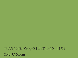 YUV 150.959,-31.532,-13.119 Color is a normal green color and the nearest color is Chelsea Cucumber #83aa5d. Hex code #88ab57 and RGB value is rgb(136,171,87). In RGB color space, this color is composed of 53% red, 67% green, 34% blue, In CMYK color space, this color is composed of 20% cyan, 0% magenta, 49% yellow , 33% black , In HSL color space, this color has a hue angle of 85° , 33% saturation and 51% lightness.