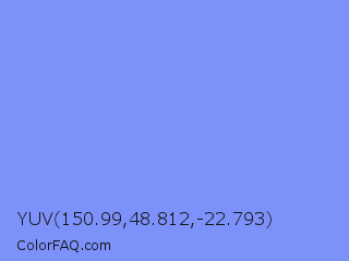 YUV 150.99,48.812,-22.793 Color is a light blue color and the nearest color is Portage #8b9fee. Hex code #7d91fa and RGB value is rgb(125,145,250). In RGB color space, this color is composed of 49% red, 57% green, 98% blue, In CMYK color space, this color is composed of 50% cyan, 42% magenta, 0% yellow , 2% black , In HSL color space, this color has a hue angle of 230° , 93% saturation and 74% lightness.