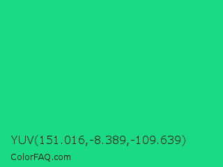 YUV 151.016,-8.389,-109.639 Color is a normal green color and the nearest color is Shamrock #33cc99. Hex code #1ada86 and RGB value is rgb(26,218,134). In RGB color space, this color is composed of 10% red, 85% green, 53% blue, In CMYK color space, this color is composed of 88% cyan, 0% magenta, 39% yellow , 15% black , In HSL color space, this color has a hue angle of 154° , 79% saturation and 48% lightness.