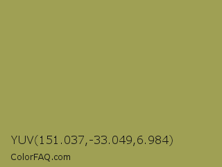YUV 151.037,-33.049,6.984 Color is a normal yellow color and the nearest color is Moss Green #8a9a5b. Hex code #9fa054 and RGB value is rgb(159,160,84). In RGB color space, this color is composed of 62% red, 63% green, 33% blue, In CMYK color space, this color is composed of 1% cyan, 0% magenta, 48% yellow , 37% black , In HSL color space, this color has a hue angle of 61° , 31% saturation and 48% lightness.