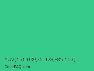 YUV 151.039,-6.428,-85.103 Color is a normal green color and the nearest color is Shamrock #33cc99. Hex code #36cb8a and RGB value is rgb(54,203,138). In RGB color space, this color is composed of 21% red, 80% green, 54% blue, In CMYK color space, this color is composed of 73% cyan, 0% magenta, 32% yellow , 20% black , In HSL color space, this color has a hue angle of 154° , 59% saturation and 50% lightness.