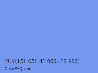 YUV 151.051,42.866,-28.986 Color is a light blue color and the nearest color is Cornflower Blue #6495ed. Hex code #7697ee and RGB value is rgb(118,151,238). In RGB color space, this color is composed of 46% red, 59% green, 93% blue, In CMYK color space, this color is composed of 50% cyan, 37% magenta, 0% yellow , 7% black , In HSL color space, this color has a hue angle of 224° , 78% saturation and 70% lightness.