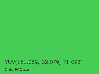 YUV 151.069,-32.079,-71.098 Color is a normal green color and the nearest color is UFO Green #3cd070. Hex code #46cd56 and RGB value is rgb(70,205,86). In RGB color space, this color is composed of 27% red, 80% green, 34% blue, In CMYK color space, this color is composed of 66% cyan, 0% magenta, 58% yellow , 20% black , In HSL color space, this color has a hue angle of 127° , 57% saturation and 54% lightness.