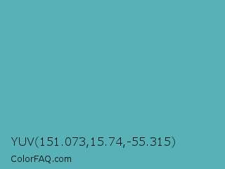 YUV 151.073,15.74,-55.315 Color is a normal cyan color and the nearest color is Fountain Blue #56b4be. Hex code #58b1b7 and RGB value is rgb(88,177,183). In RGB color space, this color is composed of 35% red, 69% green, 72% blue, In CMYK color space, this color is composed of 52% cyan, 3% magenta, 0% yellow , 28% black , In HSL color space, this color has a hue angle of 184° , 40% saturation and 53% lightness.