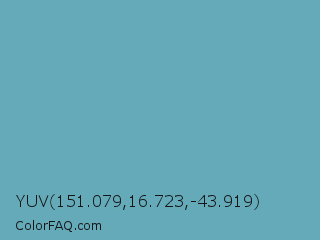 YUV 151.079,16.723,-43.919 Color is a normal cyan color and the nearest color is Moonstone Blue #73a9c2. Hex code #65aab9 and RGB value is rgb(101,170,185). In RGB color space, this color is composed of 40% red, 67% green, 73% blue, In CMYK color space, this color is composed of 45% cyan, 8% magenta, 0% yellow , 27% black , In HSL color space, this color has a hue angle of 191° , 38% saturation and 56% lightness.