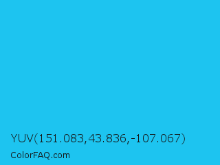 YUV 151.083,43.836,-107.067 Color is a normal cyan color and the nearest color is Spiro Disco Ball #0fc0fc. Hex code #1dc4f0 and RGB value is rgb(29,196,240). In RGB color space, this color is composed of 11% red, 77% green, 94% blue, In CMYK color space, this color is composed of 88% cyan, 18% magenta, 0% yellow , 6% black , In HSL color space, this color has a hue angle of 193° , 88% saturation and 53% lightness.