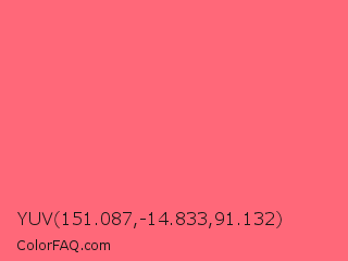YUV 151.087,-14.833,91.132 Color is a light red color and the nearest color is Begonia #fa6e79. Hex code #ff6879 and RGB value is rgb(255,104,121). In RGB color space, this color is composed of 100% red, 41% green, 47% blue, In CMYK color space, this color is composed of 0% cyan, 59% magenta, 53% yellow , 0% black , In HSL color space, this color has a hue angle of 353° , 100% saturation and 70% lightness.