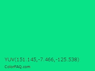 YUV 151.145,-7.466,-125.538 Color is a normal green color and the nearest color is Caribbean Green #00cc99. Hex code #08e388 and RGB value is rgb(8,227,136). In RGB color space, this color is composed of 3% red, 89% green, 53% blue, In CMYK color space, this color is composed of 96% cyan, 0% magenta, 40% yellow , 11% black , In HSL color space, this color has a hue angle of 155° , 93% saturation and 46% lightness.