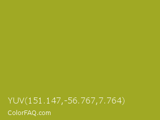 YUV 151.147,-56.767,7.764 Color is a normal yellow color and the nearest color is Citron #9fa91f. Hex code #a0a924 and RGB value is rgb(160,169,36). In RGB color space, this color is composed of 63% red, 66% green, 14% blue, In CMYK color space, this color is composed of 5% cyan, 0% magenta, 79% yellow , 34% black , In HSL color space, this color has a hue angle of 64° , 65% saturation and 40% lightness.