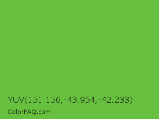 YUV 151.156,-43.954,-42.233 Color is a normal green color and the nearest color is Green RYB #66b032. Hex code #67c13e and RGB value is rgb(103,193,62). In RGB color space, this color is composed of 40% red, 76% green, 24% blue, In CMYK color space, this color is composed of 47% cyan, 0% magenta, 68% yellow , 24% black , In HSL color space, this color has a hue angle of 101° , 51% saturation and 50% lightness.