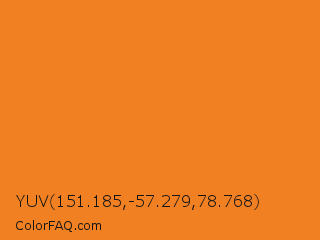 YUV 151.185,-57.279,78.768 Color is a normal orange color and the nearest color is Princeton Orange #f58025. Hex code #f18023 and RGB value is rgb(241,128,35). In RGB color space, this color is composed of 95% red, 50% green, 14% blue, In CMYK color space, this color is composed of 0% cyan, 47% magenta, 85% yellow , 5% black , In HSL color space, this color has a hue angle of 27° , 88% saturation and 54% lightness.
