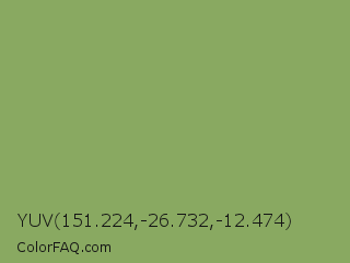 YUV 151.224,-26.732,-12.474 Color is a normal green color and the nearest color is Chelsea Cucumber #83aa5d. Hex code #89a961 and RGB value is rgb(137,169,97). In RGB color space, this color is composed of 54% red, 66% green, 38% blue, In CMYK color space, this color is composed of 19% cyan, 0% magenta, 43% yellow , 34% black , In HSL color space, this color has a hue angle of 87° , 30% saturation and 52% lightness.