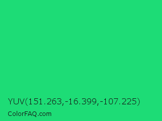 YUV 151.263,-16.399,-107.225 Color is a normal green color and the nearest color is UFO Green #3cd070. Hex code #1ddc76 and RGB value is rgb(29,220,118). In RGB color space, this color is composed of 11% red, 86% green, 46% blue, In CMYK color space, this color is composed of 87% cyan, 0% magenta, 46% yellow , 14% black , In HSL color space, this color has a hue angle of 148° , 77% saturation and 49% lightness.