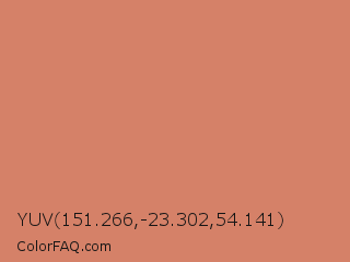 YUV 151.266,-23.302,54.141 Color is a light red color and the nearest color is Japonica #d87c63. Hex code #d58168 and RGB value is rgb(213,129,104). In RGB color space, this color is composed of 84% red, 51% green, 41% blue, In CMYK color space, this color is composed of 0% cyan, 39% magenta, 51% yellow , 16% black , In HSL color space, this color has a hue angle of 14° , 56% saturation and 62% lightness.