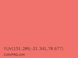 YUV 151.289,-21.341,78.677 Color is a light red color and the nearest color is Coral Reef Hipster Salmon #fd7c6e. Hex code #f1726c and RGB value is rgb(241,114,108). In RGB color space, this color is composed of 95% red, 45% green, 42% blue, In CMYK color space, this color is composed of 0% cyan, 53% magenta, 55% yellow , 5% black , In HSL color space, this color has a hue angle of 3° , 83% saturation and 68% lightness.