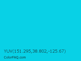 YUV 151.295,38.802,-125.67 Color is a normal cyan color and the nearest color is Dark Turquoise #00ced1. Hex code #08d1e6 and RGB value is rgb(8,209,230). In RGB color space, this color is composed of 3% red, 82% green, 90% blue, In CMYK color space, this color is composed of 97% cyan, 9% magenta, 0% yellow , 10% black , In HSL color space, this color has a hue angle of 186° , 93% saturation and 47% lightness.