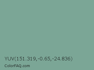 YUV 151.319,-0.65,-24.836 Color is a normal green color and the nearest color is Sea Nymph #78a39c. Hex code #7ba696 and RGB value is rgb(123,166,150). In RGB color space, this color is composed of 48% red, 65% green, 59% blue, In CMYK color space, this color is composed of 26% cyan, 0% magenta, 10% yellow , 35% black , In HSL color space, this color has a hue angle of 158° , 19% saturation and 57% lightness.