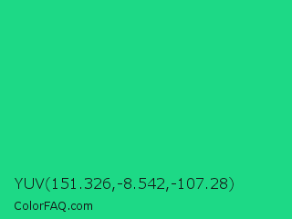 YUV 151.326,-8.542,-107.28 Color is a normal green color and the nearest color is Shamrock #33cc99. Hex code #1dd986 and RGB value is rgb(29,217,134). In RGB color space, this color is composed of 11% red, 85% green, 53% blue, In CMYK color space, this color is composed of 87% cyan, 0% magenta, 38% yellow , 15% black , In HSL color space, this color has a hue angle of 154° , 76% saturation and 48% lightness.